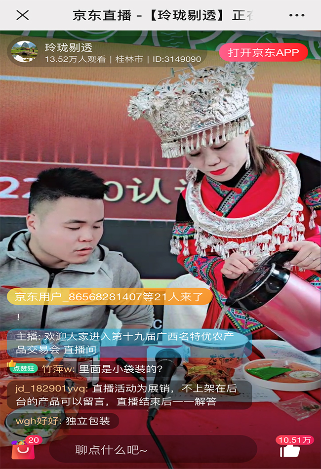 “汤红粉白、酸辣鲜爽,可口得很,今天看直播的亲们可享受一百六盒的优惠价。”广西形象馆,主播小陈面对直播镜头一边吃着螺蛳粉,一边卖力吆喝。此时,围观的除了展台前闻声前来购买的市民,还有直播间里的几万名网友。