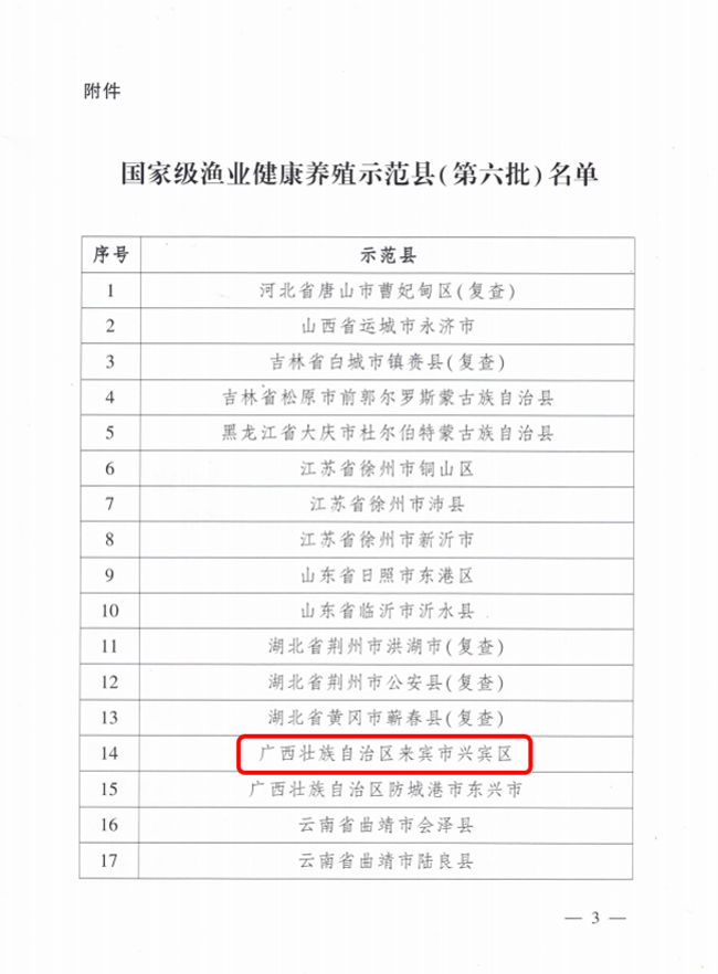 5日,农业农村部公布了第六批“国家级渔业健康养殖示范县”名单,广西来宾市兴宾区成功入选,成为广西首批成功创建“国家级渔业健康养殖示范县”验收的县(市、区),同时也是广西内陆地区首个成功创建国家级渔业健康养殖示范县的县(市、区)。