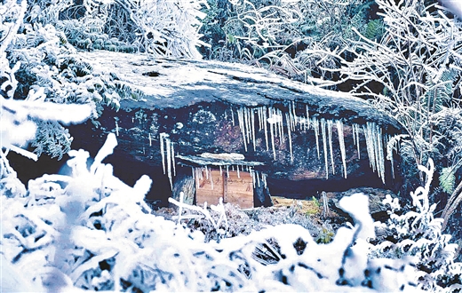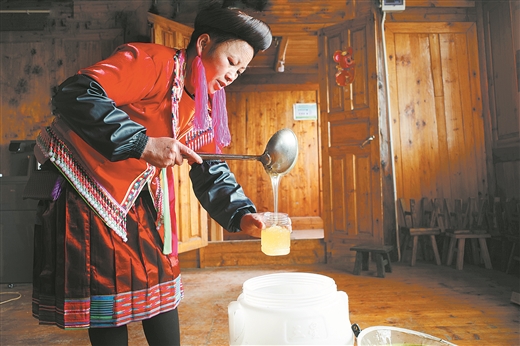 2020年12月31日上午,在三江侗族自治县老堡乡边浪村上堡屯后的白云山上,瑶族村民宛江秀趁着冰凌融化后的好天气,在海拔1200多米的一处山梁上搭盖看蜂住所。“我家在这边山上养有500多箱野蜜蜂,还种有七叶一枝花等好几种珍贵药材。我得精心照顾。”宛江秀告诉记者。 宛江秀在山上养野蜂产蜂蜜,他哥哥宛继福在村里做电商卖野蜂蜜。2020年,他们一家养殖的野蜂蜜增至1000多箱,纯收入10万元以上。目前,宛氏兄弟带动村民养殖蜜蜂增加到46户,他们在白云山上养蜂数量达3000多箱,户均年收入达2万元以上。蜜蜂养殖和茶叶、金银花种植等产业让边浪村村民生活越来越甜美。