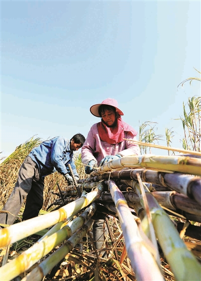 1月15日,在融安县沙子乡桐木村,农民在田间砍收甘蔗。受较强冷空气南下影响,融安县出现低温冰冻天气。连日来,融安县及时调整砍运方案,优先砍伐高寒山区和容易受低温冰冻天气影响村屯的甘蔗,组织农民抓住有利天气及时抢收甘蔗(见上图),确保能够及时进厂压榨。