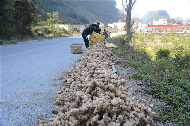 入春以来,靖西市各乡镇大肉姜陆续上市,村民忙着在地头采收大肉姜,一派春忙景象。作为扶贫产业发展的靖西大肉姜在我国华北地区一路热销,价格攀升。靖西市南坡乡逢鸡村村民黄玉花利用山沟种植大肉姜,每亩产量达3000公斤,产值达1.6万元,收入可观。