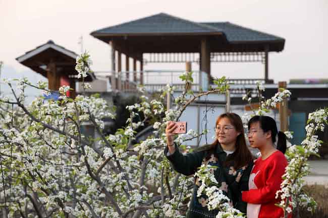 走潭头乡新桂村生态果品现代农业示范区,只见梨树上陆续冒出了又白又嫩的花骨朵,有的含苞欲放,有的已发出新芽,还有的已长出了嫩叶。微风吹过,梨园里的梨花随风飞舞,婀娜多姿。梨树下,三三两两的游人穿行在梨花中,赏花、闻香、拍照,品大自然美景,流连忘返,受大自然气息,也感受生活的温度。