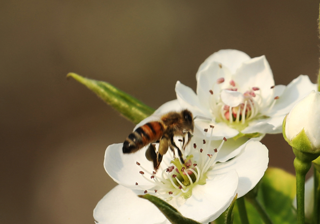 2月23日,在广西柳州市融安县潭头乡新桂村生态果品现代农业示范区,蜜蜂在梨花中采集花粉。