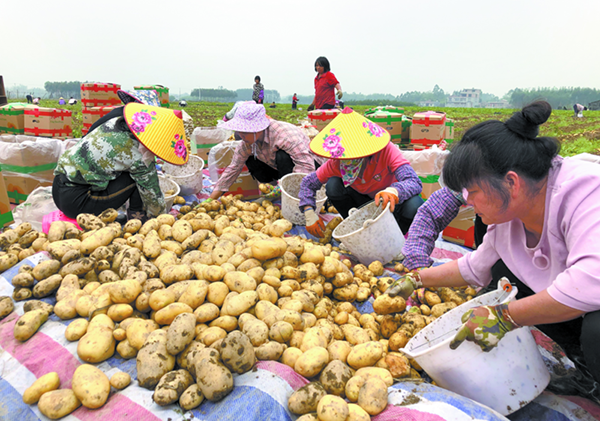 村民将马铃薯分装入箱出售