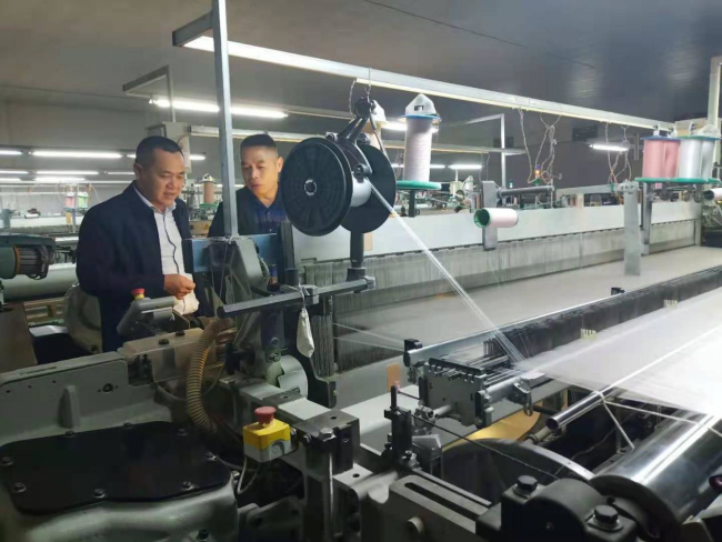 图为2021年3月11日忻城县农业农村局局长蓝乃夫(左一)同忻城县恒业丝绸有限公司总经理韦武(右一)到宜州区恒业集团总部缫丝加工车间开展调研活动
