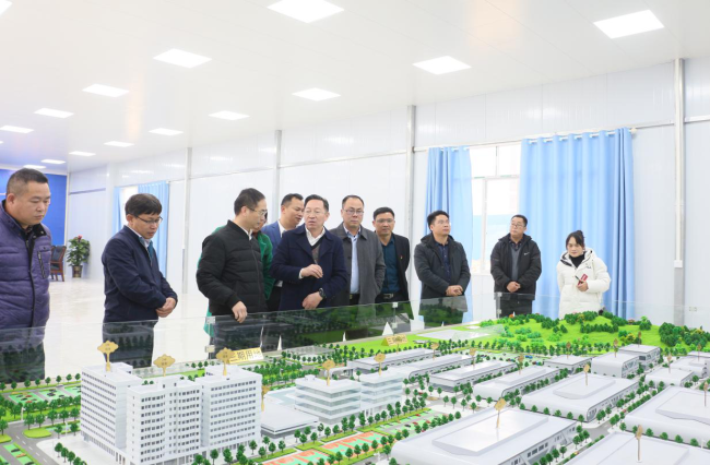 图为忻城县委书记李振品听取企业负责人介绍三江口(忻城)茧丝绸园区建设情况