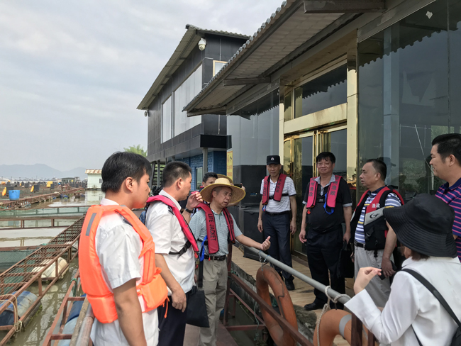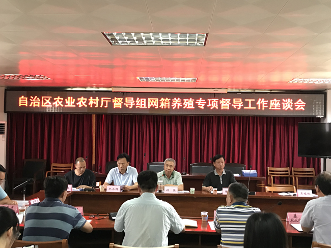 督导组一行乘坐快艇实地查看了梧州市浔江、西江段网箱养殖的情况,并听取有关企业负责人的情况汇报。在工作座谈会上,梧州市渔业主管部门和各县区农业农村部门汇报本辖区网箱养殖的情况和存在的问题;督导组一行认真听取情况汇报,并对提出的问题进行逐一解答,中国渔政广西支队执法人员对清理非法网箱养殖的法律依据进行说明,并对固定网箱、降低汛期安全风险提出了建议。