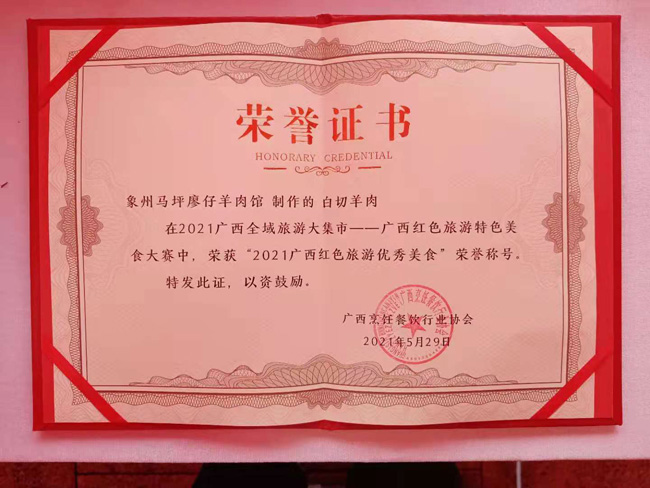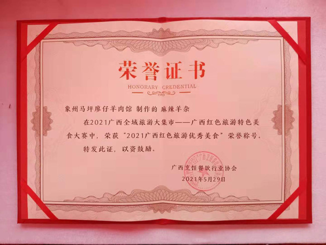象州县选送的马坪廖氏羊肉系列美食在参加2021年广西全域旅游大集市红色旅游特色美食大赛近500道参赛美食中脱颖而出,收获颇丰,其中《清水羊肉》荣获“2021广西特色旅游名菜”、《麻辣羊杂》和《白切羊肉》荣获“2021广西特色旅游优秀美食”等荣誉称号。