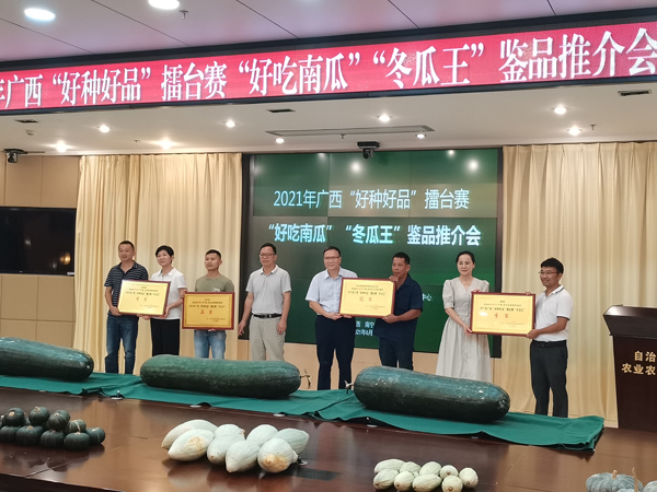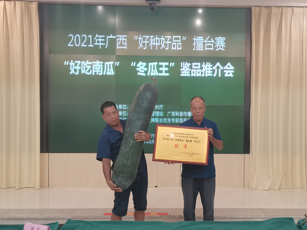 6月22 日上午,2021年广西“好种好品”擂台赛 “好吃南瓜”、“冬瓜王”鉴品推介会在南宁举行。由钦州市农业技术推广中心和钦州市种子管理站组织选送的钦北区桂农种养专业合作社那桑基地“顶呱呱”牌黑皮冬瓜,以75.9斤的单瓜重力压群雄,斩获第一名,问鼎本年度“冬瓜王”。