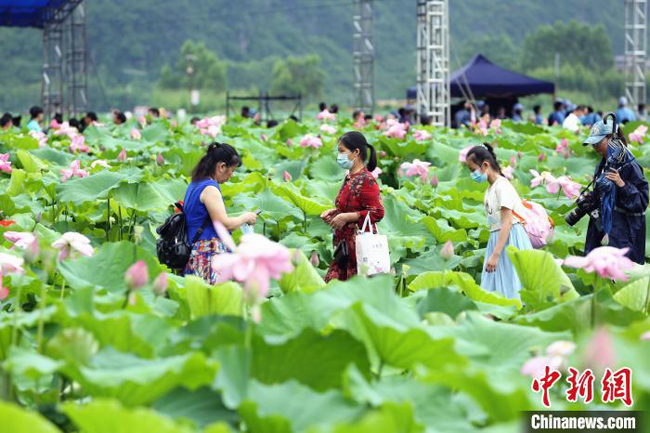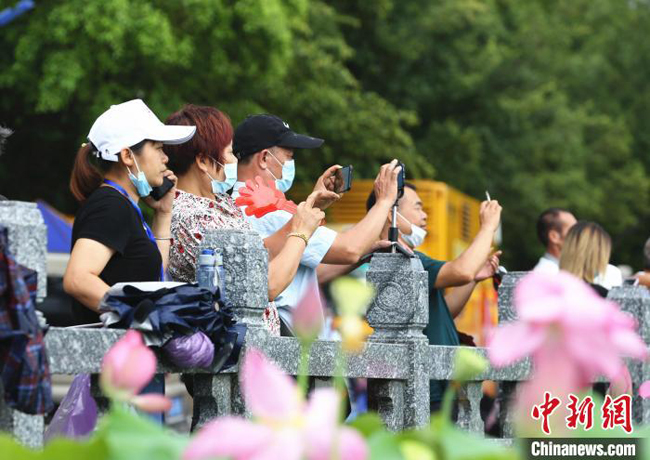 游客穿行在荷花中。