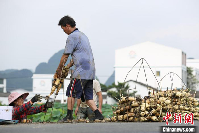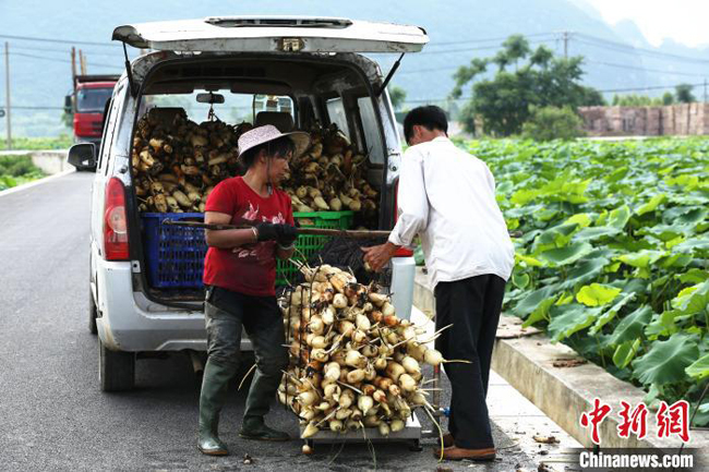莲藕经纪人在田头收购莲藕。