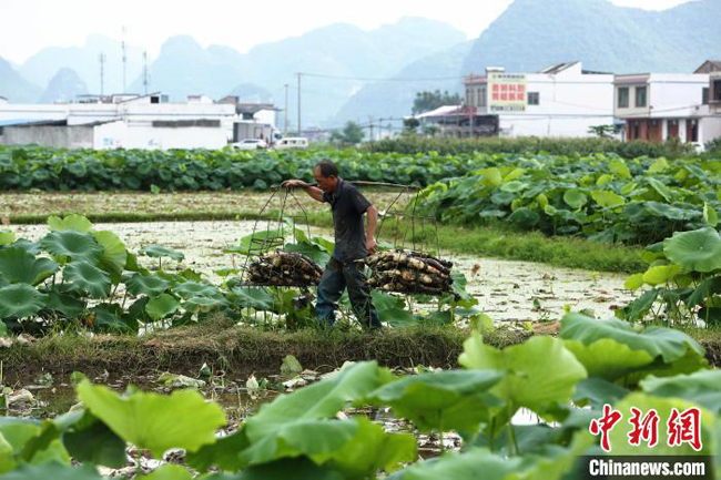 在“中国玉藕之乡”广西柳州市柳江区百朋镇的万亩藕海中,6月30日,除了藕农忙着挖藕的身影,还有游客观赏荷花、拍照留念的身姿。一根藕“连”出好吃好看好玩的产业链,百朋镇的农区变景区。
