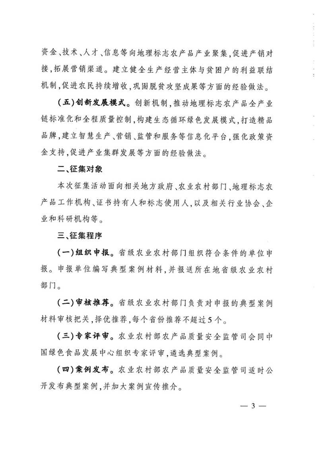 发展地理标志农产品对推进特色产业发展、振兴乡村经济、弘扬农耕文化具有重要意义。为进一步广泛宣传各地推进地理标志农产品发展的成果和经验做法,全面展示地理标志农产品保护工程的实施成效。近日,农业农村部决定在全国范围公开征集一批地理标志农产品保护与发展的典型案例。