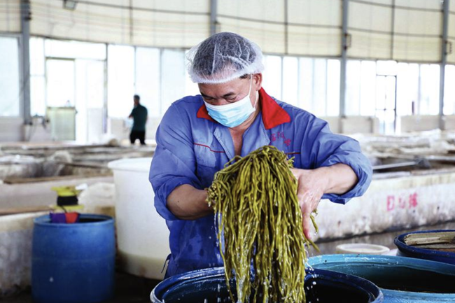 将酱腌菜发展成产业,为华联村村民拓宽了增收渠道。图为工人打捞酸豆角。