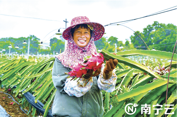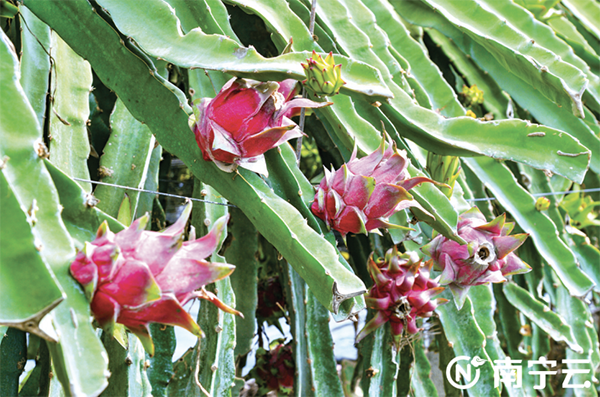 火龙果迎来丰收季。记者日前来到位于隆安县那桐镇的金穗火龙果种植基地,排列整齐的火龙果树映入眼帘,碧绿青翠中挂满了一颗颗红火艳丽的火龙果,果实满枝头,农户喜笑颜开,正忙着对果树进行修剪,准备批量采摘后出售。