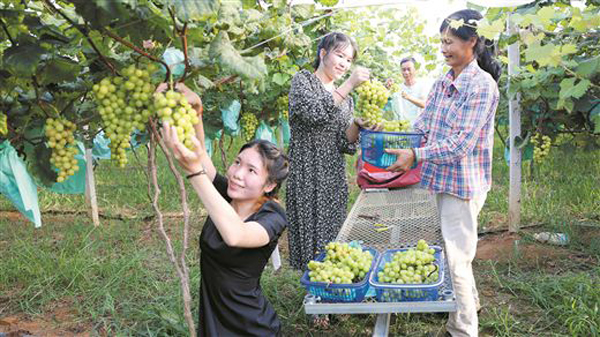 游客在平乐县张家镇家庭农场采摘“阳光玫瑰”。
