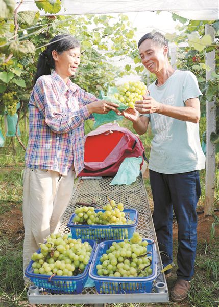 丰收的“阳光玫瑰”让微乐施家庭农场业主喜笑颜开。