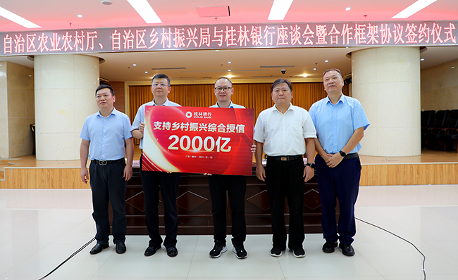 8月13日,自治区农业农村厅、自治区乡村振兴局与桂林银行签约合作框架协议,“十四五”期间,桂林银行授信2000亿元助力乡村振兴。自治区党委农办主任、农业农村厅厅长、乡村振兴局局长李宏庆,桂林银行党委书记、董事长吴东,自治区农业农村厅副厅长王凯学,自治区党委农办专职副主任、农业农村厅党组成员韦波,自治区乡村振兴局副局长杨瑞华参加签约仪式。