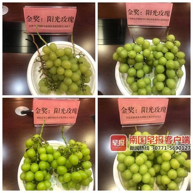 分别由桂林兴安县绿安康农业发展有限公司、广西特色作物研究院普陀基地葡萄示范园、灌阳县芳土地农业综合开发有限公司、兴安县鑫鑫水果种植专业合作社选送的阳光玫瑰葡萄均获得了金奖。