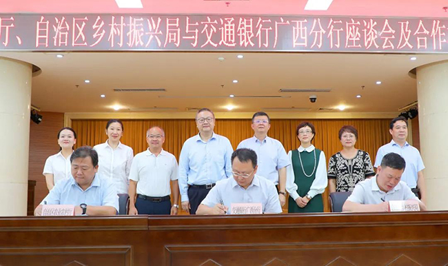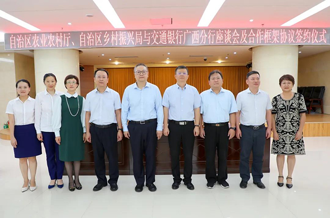 8月31日下午,自治区农业农村厅、自治区乡村振兴局与交通银行广西区分行签订服务乡村振兴合作框架协议,自治区党委农办主任、农业农村厅厅长、乡村振兴局局长李宏庆,交通银行广西区分行行长江洲,农业农村厅党组成员、副厅长王凯学,乡村振兴局党组成员、副局长杨瑞华,农业农村厅二级巡视员翁丽平,交通银行广西区分行副行长黄韶宇、周萍等参加签约仪式。