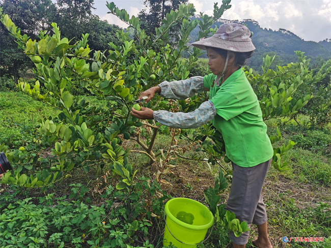 在广西宁明县峙浪乡思陵村柠檬种植示范基地,150多亩四季香水柠檬长得郁郁葱葱,枝头上挂满大大小小的果实,散发出淡淡的清香味道。
