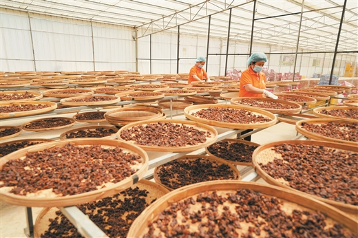 9月27日,在北流市大同果业有限公司加工车间,几十名工人正忙着包装干鲜果品,空气里弥漫着沁人心脾的水果香味。