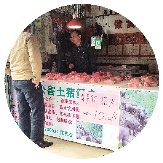 樟木市场附近一家土猪肉销售店的老板介绍,土猪肉价格一般会比菜市场里的猪肉贵一些,但是国庆节之后,他们卖的猪肉也便宜了一些,当前的特价后腿肉价格已经跌到了10元/斤。