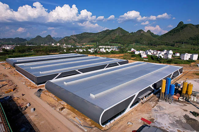 三江口(忻城)茧丝绸产业园内,新建成的三个大型厂房。
