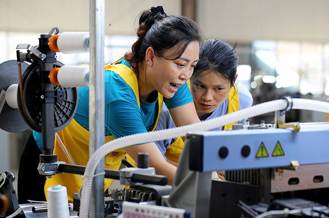 丝绸厂的老技术工人正在培训工人。