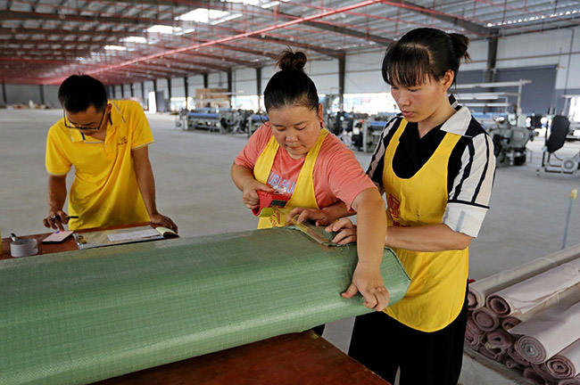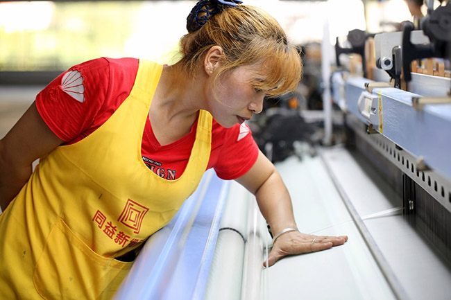 工人在打包织好的丝绸。