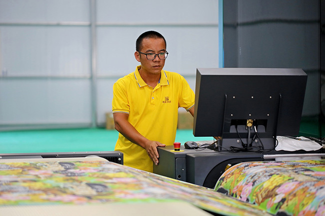 技术工人正在调试数码印花设备。