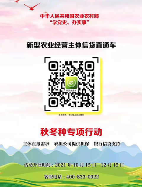 近日,农业农村部计划财务司印发《关于开展新型农业经营主体信贷直通车秋冬种专项行动的通知》,贯彻落实全国秋冬种工作视频会议精神,部署利用新型农业经营主体信贷直通车平台开展金融支持秋冬种专项行动,开通专属绿色通道,创设专属金融产品,切实增加信贷资金供给,支持稳定小麦种植面积,扩大冬油菜种植,提高冬季蔬菜供给能力,助力国家粮食安全和重要农产品稳产保供。