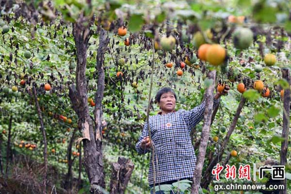 在广西桂林市龙胜各族自治县三门镇大滩村,村民在采摘吊瓜。