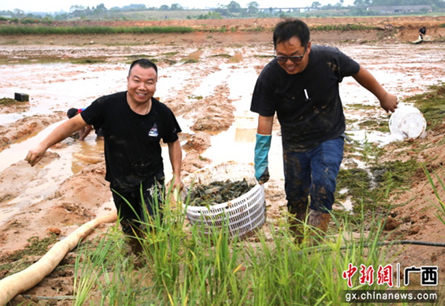 10月29日,记者来到广西贵港市港南区东津镇雷村稻虾综合种养基地看到,捕虾人员正在抽干水的稻田里熟练地捕捞成熟的澳洲淡水龙虾。稻田里水草丰富,捞出的龙虾只只色泽鲜艳、膘肥体硕,虾钳有力。不一会儿,捕虾人员便拉着虾笼满载而归。