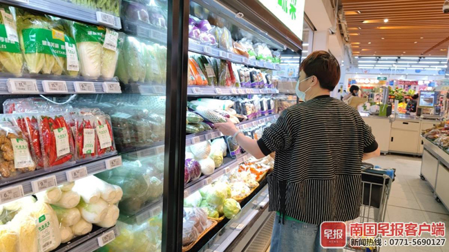 记者走访南宁某家大型综合超市发现,当前超市各类蔬菜、果品及肉蛋奶品种齐全、供应充足、价格稳定。一家超市的蔬菜货架上标示着上海青3.98元/斤,油麦菜4.98元/斤,生菜4.78元/斤,部分蔬菜价格回落,大部分价格相对持平。