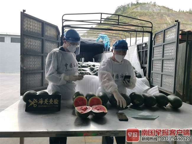 11月10日,南国早报客户端记者从友谊关海关部门获悉,11月5日,今年首票越南西瓜在浦寨互市区进境,该票货物重20.58吨、货值2.4万元。据悉,海关部门运用慧眼智控系统进行智能化监管、加强货物检疫查验等方式,确保进口西瓜安全,保障市民“舌尖上的安全”。