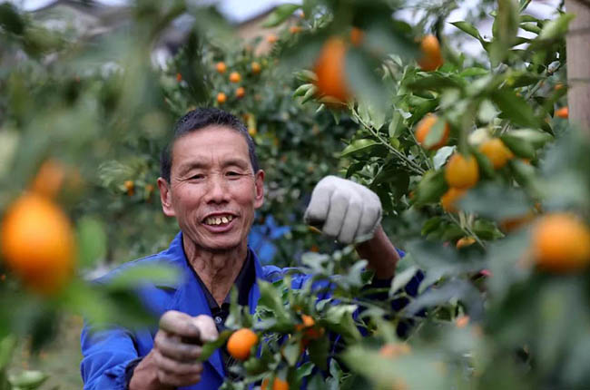 一名种植户正在田间采收金桔。