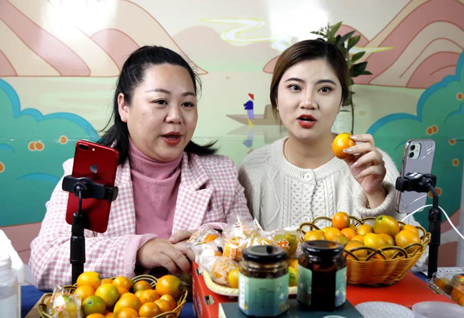 主播们正在通过视频直播销售融安金桔。
