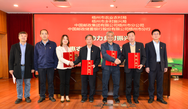 梧州市农业农村局、梧州市乡村振兴局、梧州市邮政管理局、中国邮政梧州市分公司、中国邮政储蓄银行梧州市分行相关科室、部门负责人参加签约仪式。