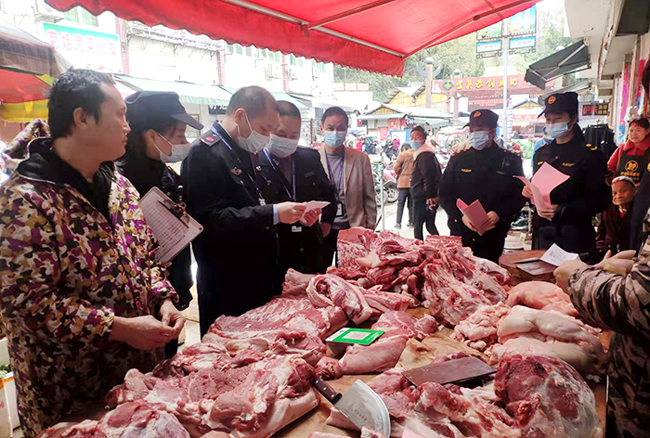 近日,为整治南丹县城区及校园周边无证照经营食品、动物产品安全存在的相关问题,县城市管理执法局、县市场监督管理局、县农业农村局执法人员开展对城区主次干道、城区各大广场、城区各学校校园周边无证照经营食品、动物产品进行整治,打击取缔店外经营、占道经营和流动经营;私屠滥宰,无“两证、两章”经营;未按规定地点和目的地经营;转让动物检疫合格证明等违法行为,保障全县人民的食品安全。