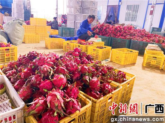 走进南宁市武鸣区甘圩镇赖坡村火龙果基地,忙碌的村民们正在将一颗颗个头饱满、颜色鲜艳的火龙果进行采摘、称重、分拣。