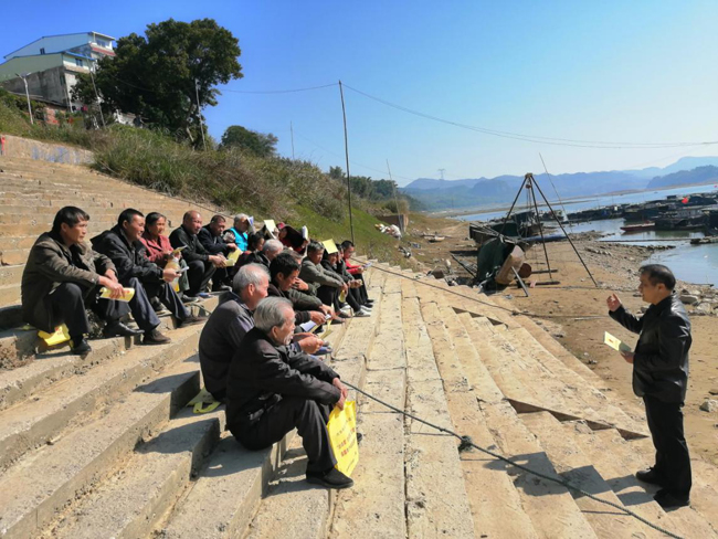 12月6日,记者来到鹿寨县导江乡渔业社码头,只见蓝天白云下,一江秋水碧波荡漾。鹿寨县农业农村局执法工作人员正利用渔民打鱼归来的晴好时机,给渔民们上安全生产教育课,为渔民们“充电”,增强他们渔业生产安全意识,提升渔民自救互救能力。