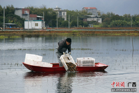 立春过后,龚州大地处处生机勃勃。2月8日一大早,贵港市平南县思界乡南荫村的稻虾基地已一片繁忙,只见几名工人摇着小船驶入水田中,将藏在水下的网笼拉起,一只只活蹦乱跳的小龙虾长势喜人。“这是育好的虾苗,今天开始陆续转移到大田养,再过20多天就能上市了。”养殖户施超凡说。