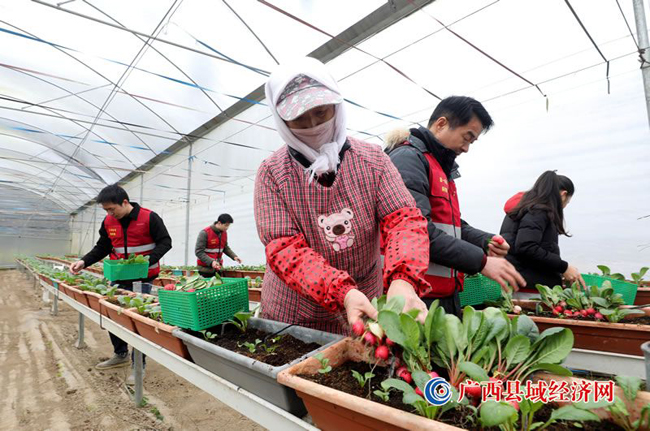 2月8日,在融安县大良镇古兰村“古兰新韵”现代农业示范基地,驻村第一书记、工作队员正在给帮助农户收樱桃萝卜。
