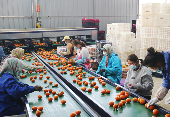 辖区企业金佳林公司工作人员将各地收购来的沃柑运送到水果分选线上清洗。