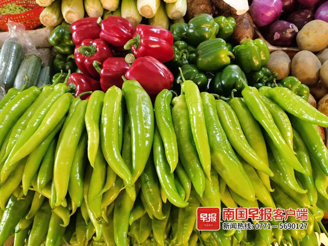 甜椒、小米椒、螺丝椒、灯笼椒……在麻村市场,红红绿绿的辣椒摆放整齐,品类丰富,满足南宁人的不同需求。但是一问价钱,却令人咋舌: