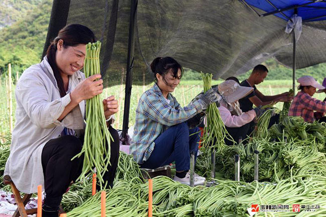 在豆角种植基地,村民忙着分拣豆角。