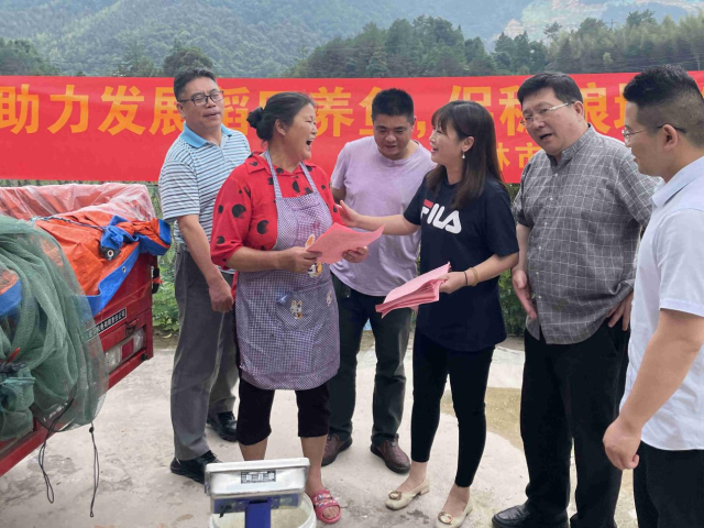 钟燕燕(右三)给领取鱼苗群众发放技术指导资料
