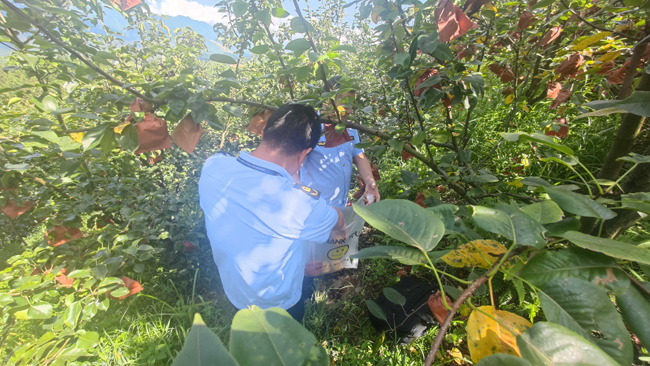 灌阳县位于广西东北部,气候温和,光照充足,雨量充沛,土质肥沃,得天独厚的生态环境孕育了品质优良、汁多甘甜的灌阳雪梨。灌阳雪梨的培育有着悠久的历史,是中国地理标志产品,近几年来每年产量高达12万吨。当下正是翠冠成熟采摘上市的季节,一筐筐个头硕大被工人们打包成盒,快递发往全国各地。灌阳雪梨靠着电商平台,打开了致富的大门。为进一步做大做强灌阳雪梨产业,结合特色产业全面推进乡村振兴,不断提升灌阳雪梨品牌价值,实现灌阳雪梨高产量高质量发展。7月12日至13日桂林市农业综合行政执法支队执法人员在灌阳县新圩镇共耕村对灌阳翠冠梨进行了现场取样、制样。