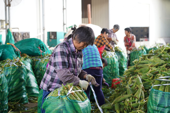 工人们正忙碌地将甜玉米进行修整、打包、装车,准备运往区内外市场进行销售。